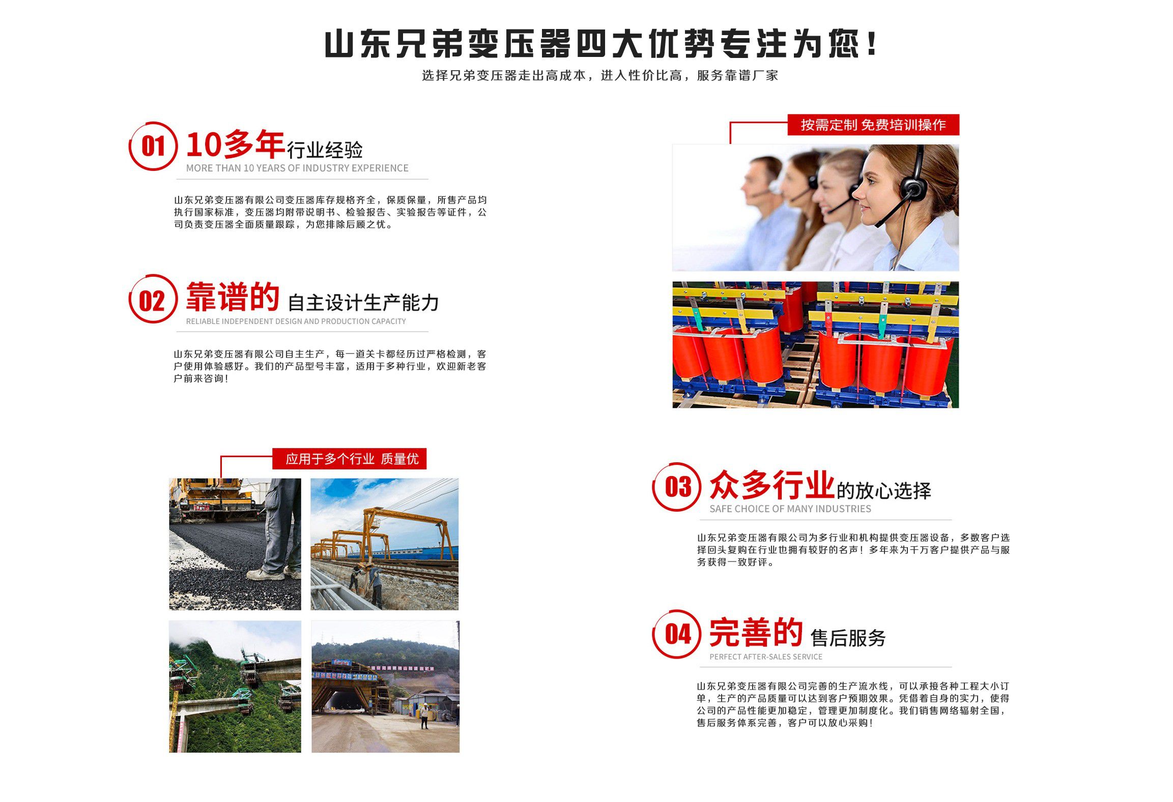 山東兄弟變壓器有限公司經營SCB10干式變壓器,SCB11干式變壓器價格,SCB12變壓器,SCB13干式變壓器,SCB14干式變壓器,SCB18干式變壓器等產品及用戶要求的特殊變壓器。 公司的質量方針是:“顧客的滿意,是我公司的追求?!眻猿仲|量,用戶至上,以質興業,以優取勝,愿為廣大用戶設計各種要求的變壓器,以求共同發展。 企業精神:“創新、求實、誠信、高效”。 企業作風:“嚴、細、實、快”。 企業工作方針:“加強內部管理,夯實基礎,全面提高職工整體素質,使企業管理水平再上新的臺階”?! 」?..